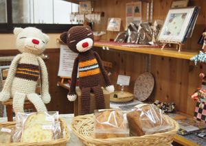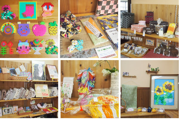 壁や木製の棚の上には、むつみの利用者さんや南区内の作業所の利用者さんが作った手作りの品物が並んでいます。